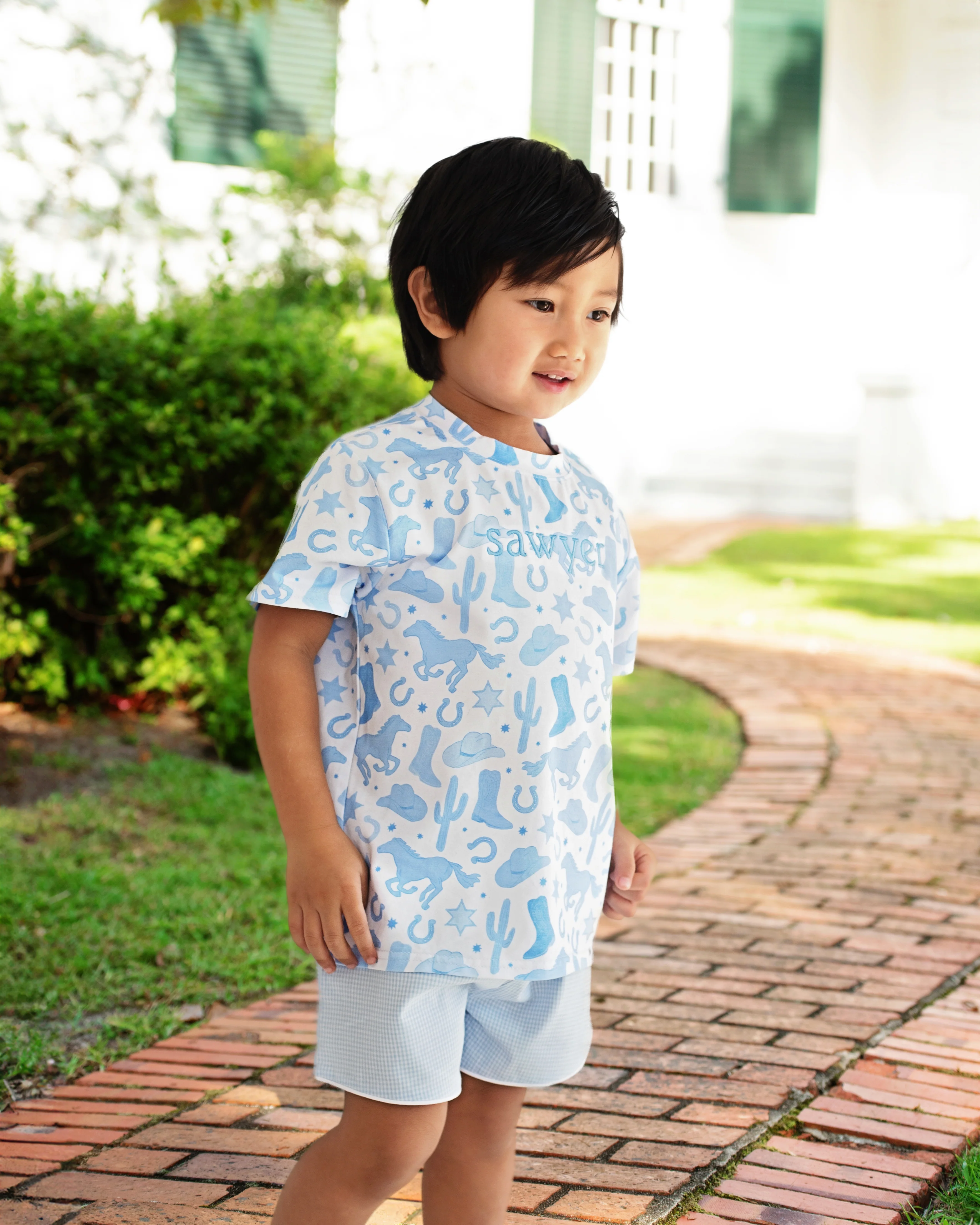 Wrangle up some fun with the Blue Gingham Rodeo Short Set, a charming Western-inspired boys' outfit perfect for summertime adventures. Showcasing a playful rodeo-themed print tee and classic gingham shorts, this set is ideal for cowboy-themed parties, playdates, and everyday warm-weather wear.