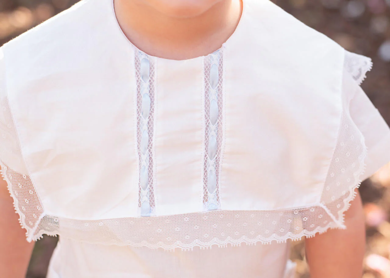 White and Blue Heirloom Button-On Outfit with Pintuck Detailing and Lace Trim