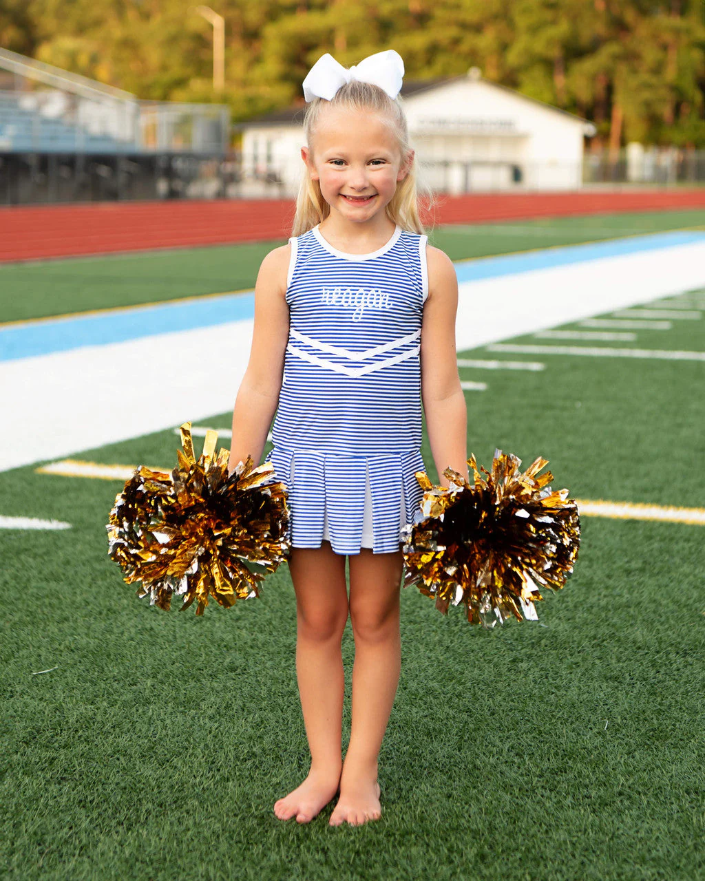 This playful Blue Striped Lycra Tennis/Cheer Dress features a drop-waist pleated skirt and optional personalized name detail. Perfect for summer outings or casual days, it combines a sporty, fun look with a custom touch.
