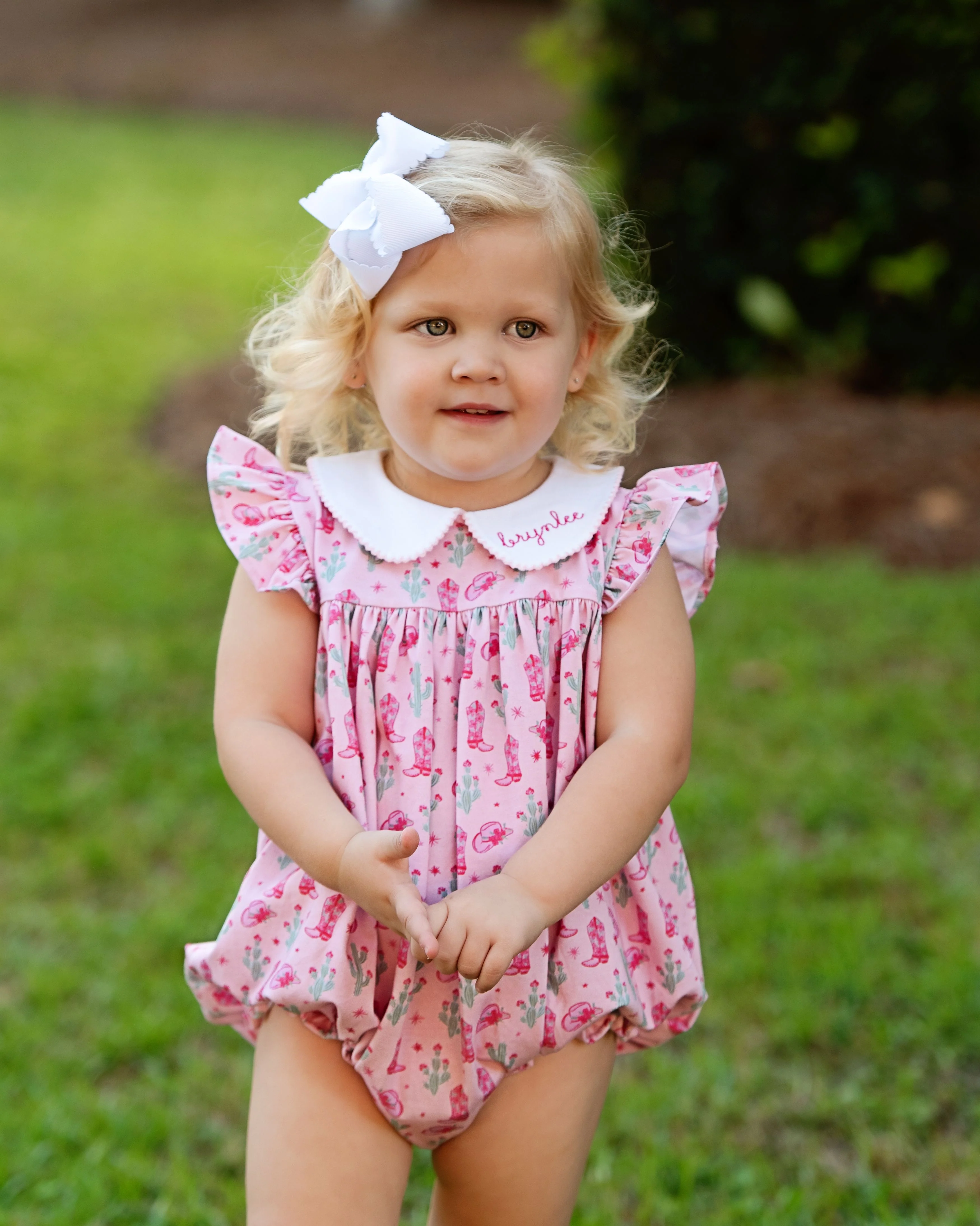 Saddle up for sweetness with our Pink And Green Knit Rodeo Bubble, the ultimate outfit for your little cowgirl! This charming bubble features a playful western-themed print with pink cowboy boots, hats, stars, and cacti, all set against a soft pink backdrop. Perfect for sunny days, birthday parties, and rodeo adventures, it’s a must-have for every little wrangler’s wardrobe.