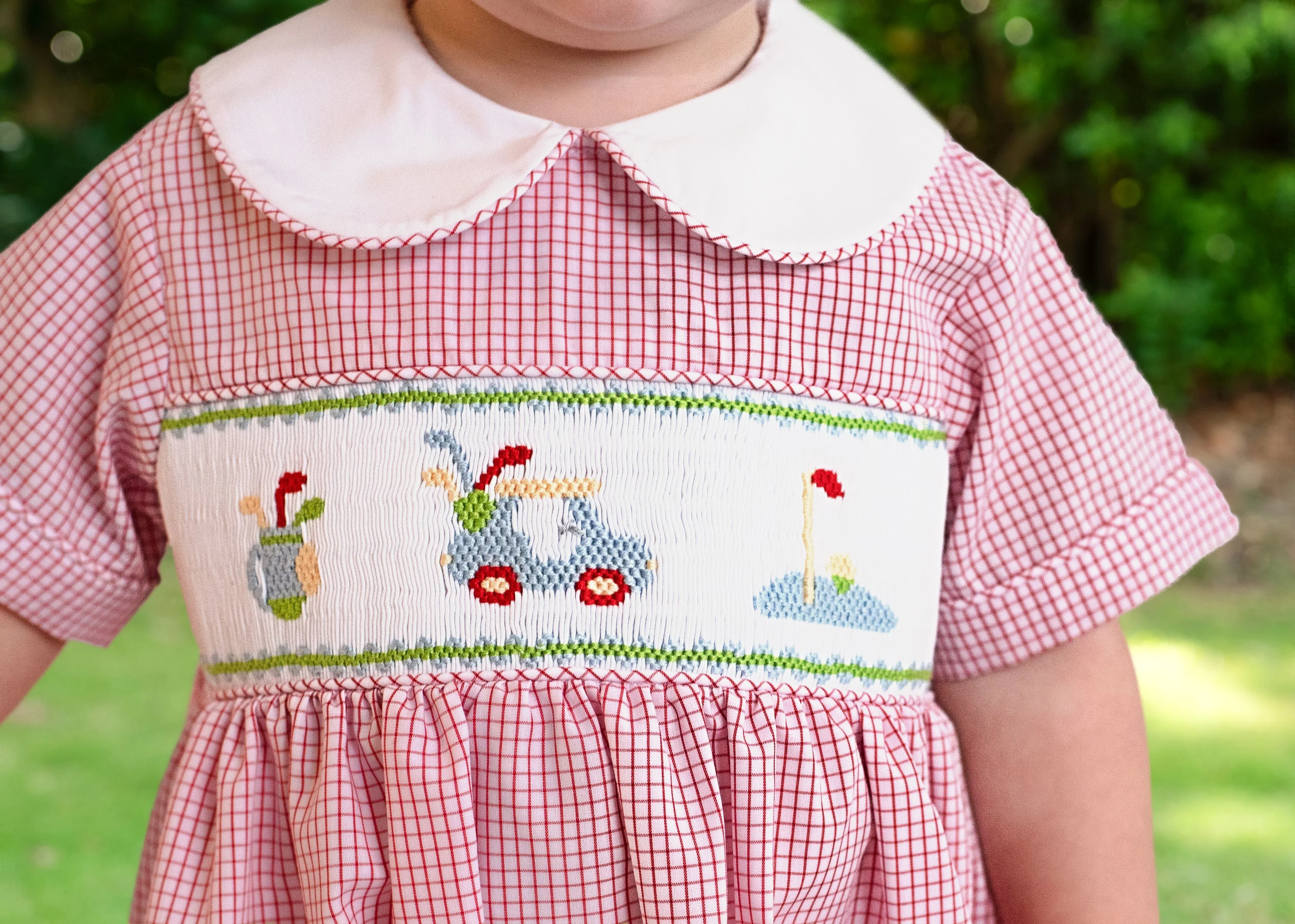 The Red Gingham Smocked Golf Bubble is a timeless classic, featuring intricate hand-smocked golf motifs across a charming gingham backdrop. Designed with a crisp white Peter Pan collar, this outfit is perfect for little golfers in training.